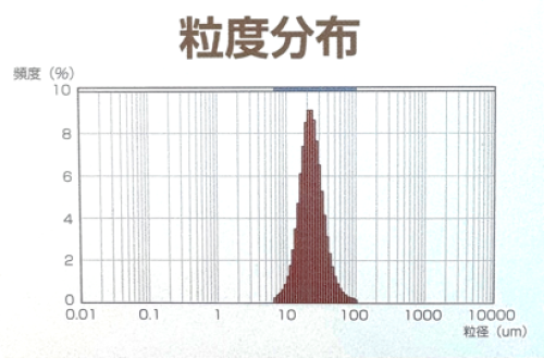 弊社のパウダーの平均粒度は約20㎛と杉荷風や小麦より細かい大きさで、100㎛以上の粗い粒子はほどんどなく、全くざらつきを感じません。
