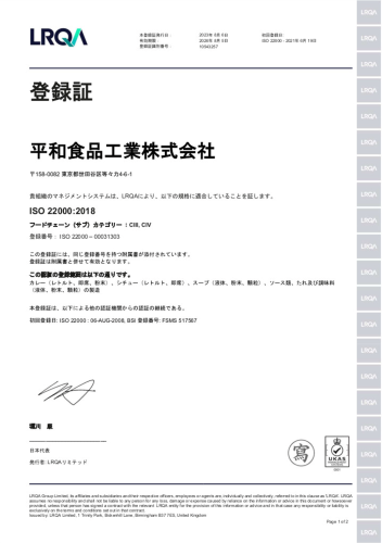 ISO22000の高度な品質・衛生管理手法を導入し、安全性の確保を徹底致しております。