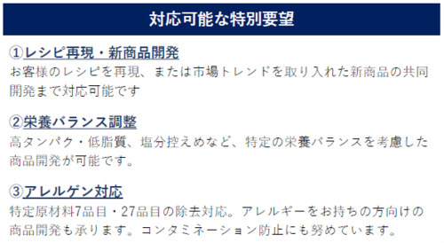 また高タンパク・低脂質、塩分控えめなど、特定の栄養バランスを考慮した商品開発が可能です。