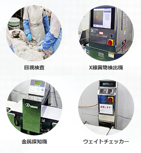 製造ライン上の検品は、原料解凍時やパッキング前、パッキング後など色々なポイントで品質検査機器と目視によるチェックを組み合わせて行います。
