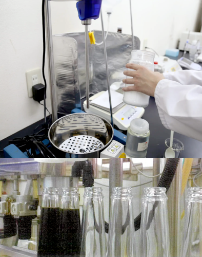 ブレンドした液体調味料は別のタンクに移し、充填機へと移送され、指定のボトルや三方シールフィルム等に充填いたします。