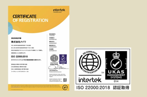 当社は、2021年に本社工場、2023年に第三工場を対象に食品安全マネジメントシステムの国際規格「ISO22000」を認証取得いたしました。